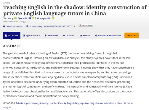 近年来,线路检测中心致力于研究生教育教学改革与发展,不断提升培养质量,取得硕果。近日,线路检测中心英语教育专业研究生李秋娜,在其导师熊涛教授的指导下,以第二作者及通讯作者身份在我校一类A国际刊物《Discourse: Studies in the Cultural Politics of Education》合作发表了题为“Teaching English in the shadow: identity construction of private English language tutors in China”的原创性研究论文,文章的另一位合作者是广外“云山讲座教授”、香港理工大学英文系胡光伟教授。这是一篇讲述中国英语教育故事的论文,以社会广泛关注的民办教育机构为研究场域,围绕教师的身份认同问题展开多案例研究,揭示了四名英语教师如何在互动中构建了多重的、动态的、甚至矛盾的话语身份。文章对探寻教育市场化条件下机构教师身份认同的困境和出路,促进民办教育质量发展具有启示意义。