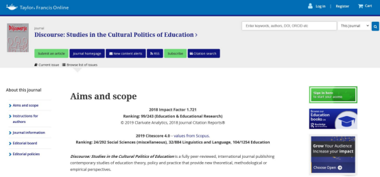《Discourse: Studies in the Cultural Politics of Education》是教育话语、教育政策、文化政治研究方面权威的同行评议期刊,为社会科学引文数据库(SSCI)收录期刊,JCR分区为Q2,该期刊影响因子为1.729(2019)。