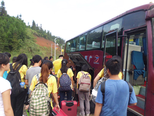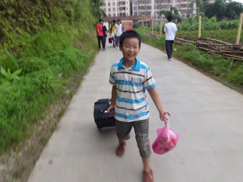 29日早晨,学生早早就起了床。当多数队员带着行李走出宿舍楼梯,前往食堂最后一餐时,已经有不少学生聚集在宿舍楼下。这里没有酒,也没有茶水,就让相机的镜头留下这一刻,记下你的面孔。此时虽说眼泪很争气,没有掉下来,但师生心境已经是万分心酸。在送别的学生当中,有一个小学班的名叫李想的小男孩,课堂上他十分活跃,可爱的笑脸机灵的眼神,加上他童稚而又尖锐的嗓子,服务队队员无不对他喜爱有加。今早,他特地来为大哥大姐送行。“让我来背背书包,让我来拉(行李箱),我不能没背东西。”队伍动身前往大道等候大巴时,他对着拿着大包小包行李的队员说。背包沉重,行李箱几乎高过他的个头,但这小家伙,本着我能为你做些什么的理念,深深感动着每一个人。