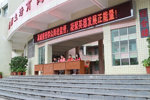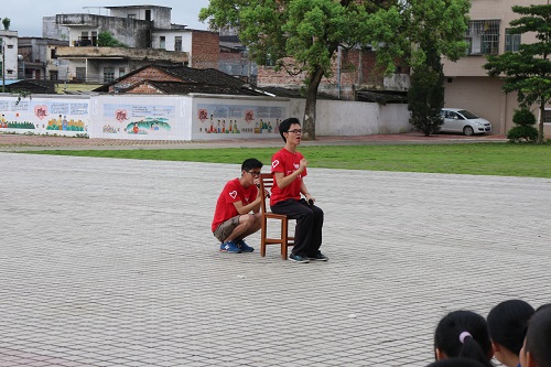 一切准备就绪后,开幕式于早上8点45分正式开始。首先是大湾中学领导上台讲话。在讲话中,大湾中学的领导对我们这次活动给予了充分的肯定与支持,中学领导的重视增添了大湾服务队队员的使命感与责任感。学校领导和大湾服务队队员十分看重此次活动,清远大湾队队长向中学领导赠送了旗帜,旗帜上写着“春风化雨,润物无声”,象征着我校为当地学生的辛勤付出。