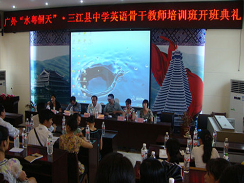 7月24日早,广外大“水粤侗天”之三江中学英语骨干教师培训班开学典礼在三江中学的学术报告厅正式开幕。本次培训活动,旨在提升三江骨干教师的英语教学水平,进而更好地进行日常英语教学。出席开幕式的有县教育局副局长龙怀益,三江中学校长李吉祥,三江中学副校长石少明,广东外语外贸大学js3333线路检测中心教师的苏春和周洁,以及参与培训的教师和广外大的助教们。杨春琼主持了本次典礼。