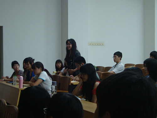 在《天使》的歌声中,队长们通过PPT和视频对清远大湾服务队所服务学校的基本情况和教学条件一一作了介绍。历史悠久,获奖众多是大湾队的一大特色,今年的下乡工作更是由具有两年下乡经验的钟迪师兄领队。队长们强调大湾队的最大特色就是心理辅导及心理学研究这一门课程的开展,这是大湾队独一无二的特色课程。展示的末尾,队长们热情地号召同学们的加入——“只要你有勇气,你有实力,大湾就为你提供舞台”。