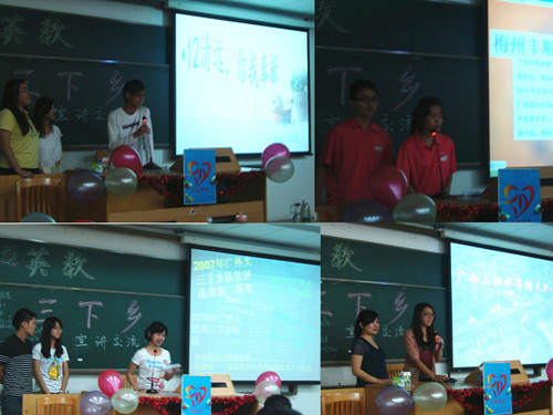 在展示过程中,梅州队的队长们提到本队与其他队的区别在于:队伍人数庞大,指导老师多,一流的住宿条件以及雄厚的师资力量,并且是三下乡义教和英语教师培训相结合的一项活动。梅州队条件相比其他队伍可谓是相当优越,学院补贴经费、良好的办公备课环境和配备空调热水的住宿条件无不充满着诱惑。梅州队所展示的下乡照片也颇为吸引人,拥有纯真笑脸的“梨涡女孩”以及古灵精怪的“忐忑男孩”充分展现了孩子们的可爱,瞬间俘获了现场诸多观众的心。