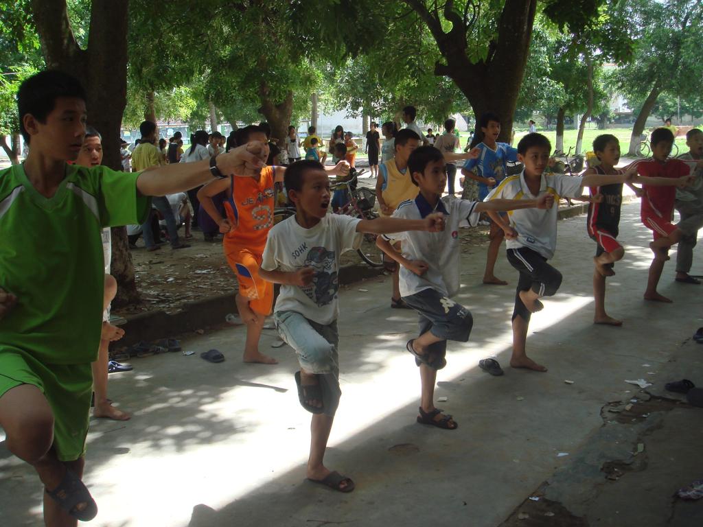 “哈!哈!哈!”一阵节奏分明且气势磅礴的呐喊声在教学楼前的空地上久久回响着。原来是陈威老师在带武术表演的学生们练习。只见学生们个个打得有招有式,出拳踢腿的力气和气势都可圈可点。