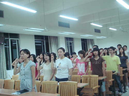 然后会议主持刘秋萍又详细补充了此次三下乡活动的各项要求与注意事项,如例会制度、应急方案、保险理赔事宜、活动评优细则等等。紧接着进行的是庄严的三下乡宣誓仪式。