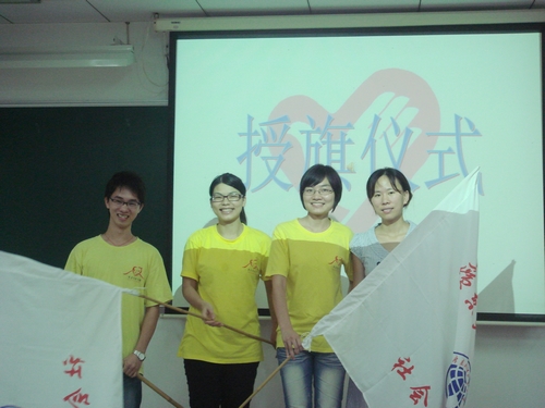 之后进行的是神圣的授旗仪式。迟老师为三下乡各大队队长——清远队队长刘秋萍、端州队队长陈文婷、企水队队长陈哲帆授旗。