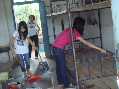 一打开宿舍的门,我们便被眼前的景象所惊呆了:年久失修的残破窗户、灰尘久积的床板、颇有艺术泼墨之感的墙壁涂鸦、床底下上届学生的“赠品”、还有更让女生心有余悸的各种“小型的爬行动物”……我不禁暗自感叹:看来自己之前对本次旅途所充满的好奇心与美好遐想似乎过于理想化了。尽管现实的骨感与理想的丰满确实给我们带来了一定的心理落差,但是,既然我们怀着同样的梦想齐聚此地,那么谁都不想轻易言退。虽然这里的条件艰苦了些,但这不正是三下乡的挑战与意义所在吗?