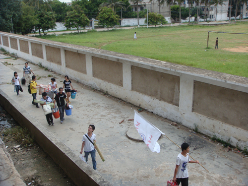 本着“还我整洁宿舍”的宗旨,我们在休息片刻之后便展开了宿舍大清扫行动。有言曰:“此时不洗,更待何时?”于是,清洗进行曲隆重开始!冲洗床板、刷洗厕所、清理阳台,还有技术含量较高的天花板“扫网”行动。在此期间,自来水就这样一桶一桶地欢快地流淌着,大家打扫的热情也异常高涨,都洗得不亦乐乎。将近一个小时之后,宿舍终于大概还原了它本来的面貌。看着自己的劳动成果,全体队员都欢欣雀跃。