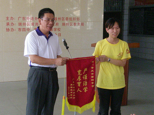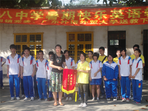 烈日炎炎,但大家如火的热情并没有减退。启动仪式开始,肇庆市端州区黄岗镇副书记胡根华和肇庆市端州区关工委第一副主任蔡植雄先后发表了讲话,表达了对此次三下乡活动的大力支持与美好祝愿。紧接着,广东外语外贸大学js3333线路检测中心辅导员兼此次下乡活动的带队老师迟殿凤发表讲话。她对三下乡过程中的具体要求和注意事项作了简要的讲解,并向肇庆市第四中学赠送了锦旗,以表广外英教学院对肇庆四中的大力支持的感谢。
