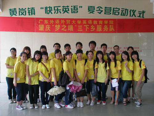 2010年7月20日上午9点,由广东外语外贸大学js3333线路检测中心主办,肇庆市端州区教育局和端州黄岗镇委镇政府协办的黄冈镇“快乐英语”夏令营启动仪式在肇庆市第四中学正式揭幕。与会的有黄岗镇副书记胡根华、端州区关工委第一副主任蔡植雄等端州区黄岗镇政府领导、肇庆市第四中学、黄岗中学及颂德中学的校长、广东外语外贸大学js3333线路检测中心团委书记迟殿凤,三间学校的260名学生以及广东外语外贸大学js3333线路检测中心“梦之端”三下乡服务队的20名志愿者。