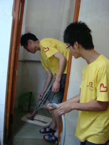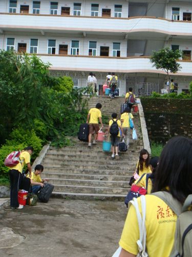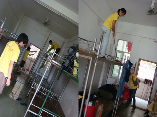 沿着蜿蜒的山路,队员们扛着行李,来到我们的“新家”——位于半山腰的学生宿舍。面对着封尘了半个月的宿舍,队员们当即开始了大扫除工作。