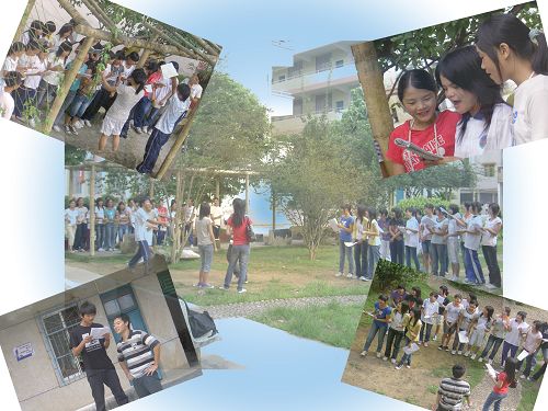 早读课上,老师们一改传统的教法,带领学生走出教室,在青草的新鲜气息和阳光的温柔抚摸下开口说英语。图中中学组1班和6班正在斗读,在老师的不断鼓励下,本来沉默的学生暴露出了原始的斗争性,歇斯底里地高声朗读。另外,老师还鼓励一些学生站在石凳上面对全班同学大声朗读,让学生有勇气认识内在的血性的自我,冲破自卑的枷锁。