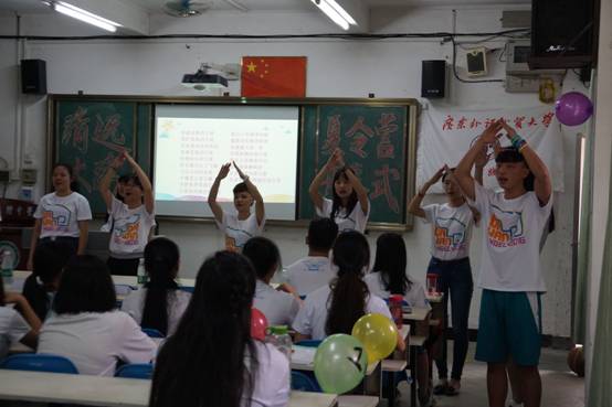 在节目表演环节中,服务队的队员们用自己精心准备的节目向领导老师以及学生们展示自己。歌曲串烧、手语操《天使》、舞蹈《Sorry Sorry》、双簧《跳水》还有大合唱《仰望星空》,这五个节目展示了队员们对即将到来的夏令营之旅的期待,精彩的节目也在现场赢得了阵阵掌声。