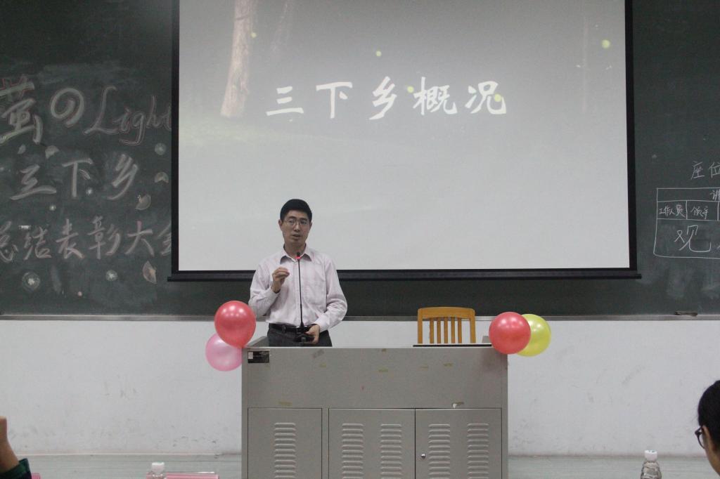今年是英教学院三下乡开办十周年,因此本次大会受到了学院领导的高度重视。主持人简单介绍大会流程后,邀请徐昶斌上台发表讲话。徐昶斌提出:“三下乡总结大会的召开非常有意义。因为做事情要有计划,有总结,这样才能真正通过活动提高自身各方面能力。”他指出 “我们既要为受支教地区经济文化教育事业带去新的东西,将三下乡活动与当地各项事业紧密结合。也要提升自身各方面能力,锻炼自身,为将来做好打算。”