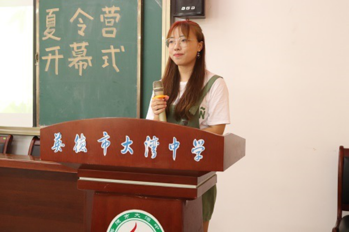 紧接着莫舒华作开幕式致辞。她对大湾中学多年来的诚挚合作表示衷心的感谢,同时表示今年的大湾服务队依旧会付出百分百的努力将夏令营活动办得更加精彩。莫舒华提出,大湾服务队依旧会充分发挥js3333线路检测中心的专业优势,为大湾学生提供类型多样、内容充实的非传统英语课堂,帮助学生们在轻松愉悦中找到学习英语的乐趣并激发他们对英语学习的热情和信心。同时服务队还将开设第二课堂必修课、兴趣班等一系列有助于丰富学生知识面、培养学生兴趣特长的课程。另外,服务队将为大湾学生们举办趣味运动会、足球嘉年华等精彩的课余活动。调研组也会在乡村振兴背景下开展以“农村过期药品的处理现状与影响因素分析调查(及对策)”为主题的调研活动,力图为大湾美丽的乡村建设贡献出一份力量。