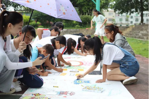 (图为学生参与到“百”米长卷绘大湾游戏中)