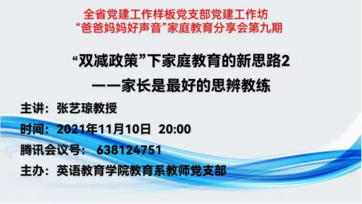 为进一步深化党史学习教育“我为群众办实事”实践活动,凝聚群众、服务群众,发挥支部在教育中的优势,教育系教师党支部于1110线上举办党建工作坊:第“爸爸妈妈好声音”家庭教育分享会。本次党建活动继续“双减”政策下的家庭教育主题,教育系教师党支部书记张丽冰主持,邀请张艺琼教授“家长是最好的思辨教练” 进行分享