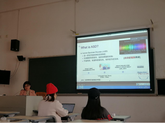 会上,李群向同学们介绍泛自闭病谱系障碍(ASD)的界定、共存疾病、常见迹象等,通过一系列生动具体的例子,帮助大家了解自闭症儿童这一特殊儿童群体的语言和心智发展特点,拓宽了同学们的视野。紧接着,她向同学们介绍了言语语言治疗师(SLP)在国内的发展状况以及未来的发展前景,为同学们的就业发展方向提供了一个新思路。