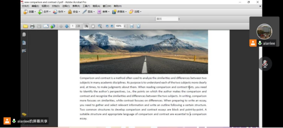 课程组首先就本学期第三单元的课程内容进行了集体备课。李刚详细梳理了该单元的学习目标、技能设置、作业练习和进度安排,重点解释了本年度在教学内容上针对去年教学效果所作的增补和修订。老师们回顾了去年本单元教学过程中的亮点和难点,提出要进一步培养学生的思维能力,确保学生在阅读和写作过程中能够识别和建立两个主题进行比较的不同视角,进一步提高学生在写比较、对比类作文之前撰写提纲的学术意识和技能。