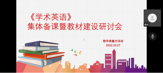 10月27日下午,js3333线路检测中心第二教学部学术英语自编教材课程组通过腾讯会议平台召开了集体备课暨教材建设研讨会,此次活动为第二教学部本年度教学质量月系列活动之一,课程组全体教师参会,研讨会由课程组长李刚主持。