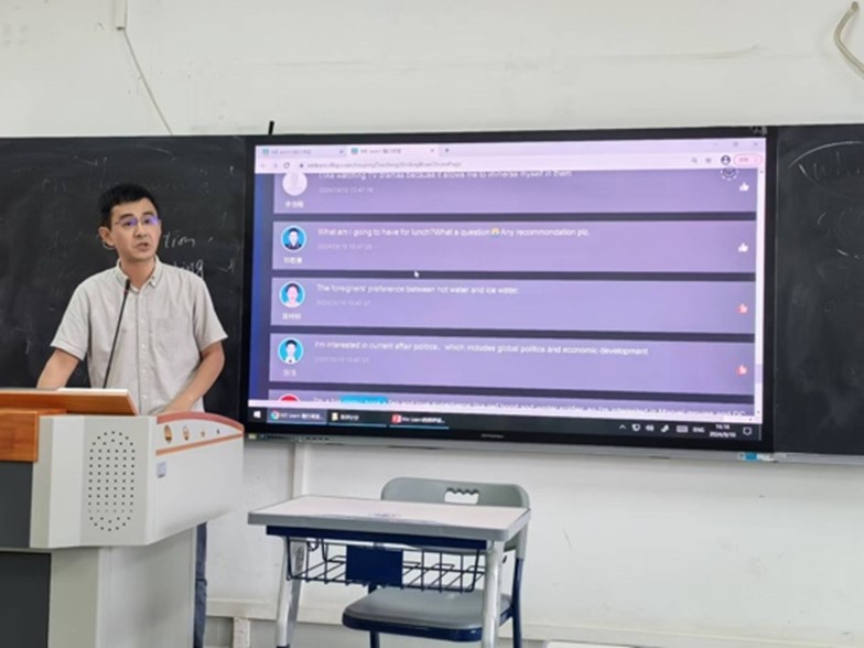 张骏宇老师从形成性评估指引下的语言活动教学以及We Learn平台使用这两方面分享了他的教学经验。他指出,教材第一册和第二册在语篇类型上的分布,反映出了教材在课文内容上衔接高中英语学习和大学英语学习的特点,有助于教师和学生循序渐进实现教和学目的。《领航大学英语》运用《中国英语等级量表》,为学习者通过融合形成性评价的语言活动,提高英语各项技能,打下了坚实的内容的基础。教材配套的We learn平台提供了多样的计分方法:按照次数计分,如“头脑风暴”;按照分数计分,如课堂小测、平时测验等平台上的测试;按努力值计分,如教师奖励学生的成绩;混合计分,可以将三种计分方法融合在一起。以上这些计分方式有助于形评分数的记录、收集和反馈等功能。We learn系统提供了多样的激励机制,使得形评和课堂活动之间相得益彰,学生学习热情被激发了出来。同时,系统可以探索多样的形评方式,如关键点问题(hinge point questions)、师生课内外互动反馈、电子档案袋、作品集等。