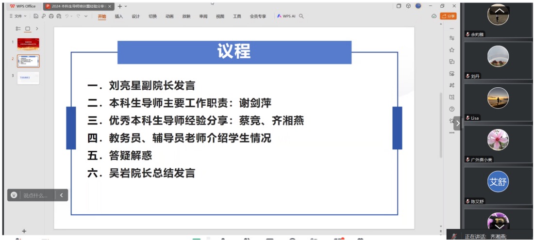 学院刘亮星副院长在会议致辞中指出,本科生导师制是为了促进学生全面发展而实行的学生服务与支持体系,目的是倡导教师更多地参与本科生指导工作,发挥教师在学生培养中的主导作用和学生的主体作用。同时,他也对学院新任本科生导师提出希望,鼓励他们积极探索新路径、尝试新方法。师范系谢剑萍主任详细介绍了学院2022版本科生导师工作实施方案,从学业、科研、职业指导等多个方面详细介绍了本科生导师的工作内容与工作职责,并对本科生导师规范和操作流程进行了解读。
