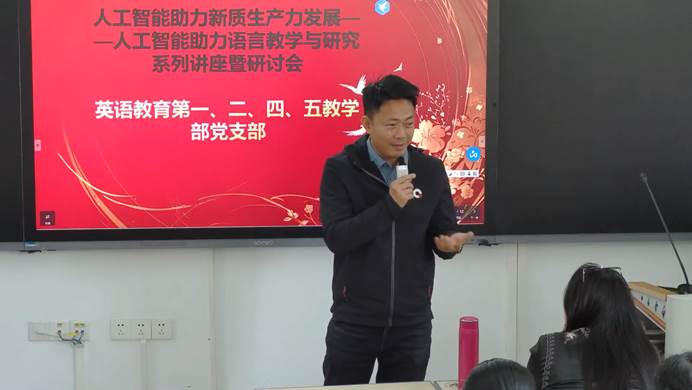 3月20日中午,在校园里木棉花和紫金花的见证下,北校第一教学楼南105报告厅座无虚席,js3333线路检测中心“党建引领人工智能赋能教育创新——智能技术助推新时代语言教学与研究高质量发展系列讲座暨研讨会”(第三场)在此隆重举行。研讨会由第四教学部党支部书记周金华主持,来自四个教学部党支部的党员教师及骨干教师齐聚一堂,共同见证人工智能技术与语言教学研究的深度融合。