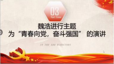 广外大学生党史宣讲团院队成员、英教非毕业班学生党支部预备党员魏浩进行了主题为“青春向党,奋斗强国”的演讲。魏浩同学从“中国共产党”这一词条的介绍中看到了党的伟大,并指出党的伟大源头之一是五四运动。他强调,五四运动中的青年人无不选择了以奋斗作为他们青春的底色,这启示当代青年人更好认识自身的使命,处在新时代这一环境中,我们青年一代应向先辈学习,努力奋斗,把国家和人民放在心中,以青年的力量在我们的时代创造我们的伟大。