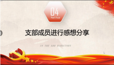 会上播放了英教党史宣讲团成员潘咏意同学的宣讲视频。潘咏意同学以“学党史、颂党恩、跟党走”为主题分享自己学习党史的心得。她明确点出长津湖战役中呈现的爱国主义精神、伟大斗争精神与国际主义精神,深刻总结出辛亥革命中体现的为振兴中华矢志不渝、为国家发展目标不断努力的精神。同时,她深情回顾党的百年征程,从南湖红船、南昌起义、井冈山道路以及红军长征、抗日战争中体悟“奋斗创造历史,实践决定未来”。最后,她对支部成员提出以下建议:英教学子应该用外语讲好中国故事,要承担起向下一代传承红色基因的责任,为教育事业贡献自己的力量。