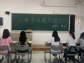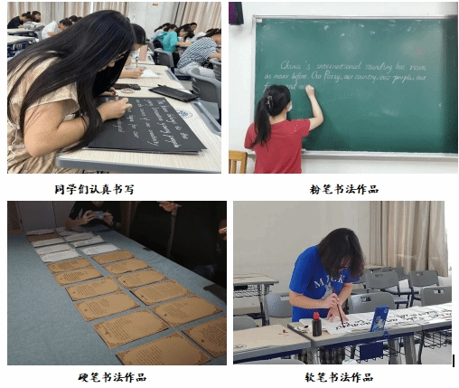 活动中,本科生导师在研习《习近平谈治国理政》第三卷英译本后,选定其中一章的内容分发给各班学生学习,最后集中组织学生开展书法展示班会。班会上每位选手选取所发材料中的名言金句进行书写,书法形式不限,硬笔、软笔、粉笔均可。学生们充分发挥自己的主观能动性,如现场带笔墨纸砚进行书写,或统一用装帧精美的卡纸作为背景,或在黑色卡纸上用银色笔模仿粉笔书写的效果等等。