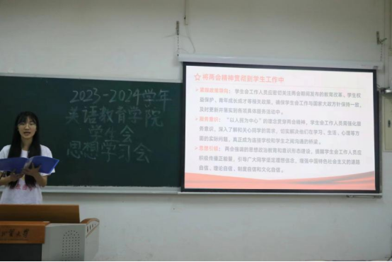 何川熙详细地阐述了学生会应如何将两会精神贯彻到学生工作中的举措。她指出,两会精神对学生工作有着重要指导意义,学生会要做到紧跟政策导向,增强服务意识,做好思想引领;要增强实践锻炼与创新能力,培养民主素养,并加强纪律与作风建设。她希望学生会工作人员在履职过程中能够既具备高度的政治敏感度,又以人为本,打造一个富有成效,深受同学信赖的学生自治组织。