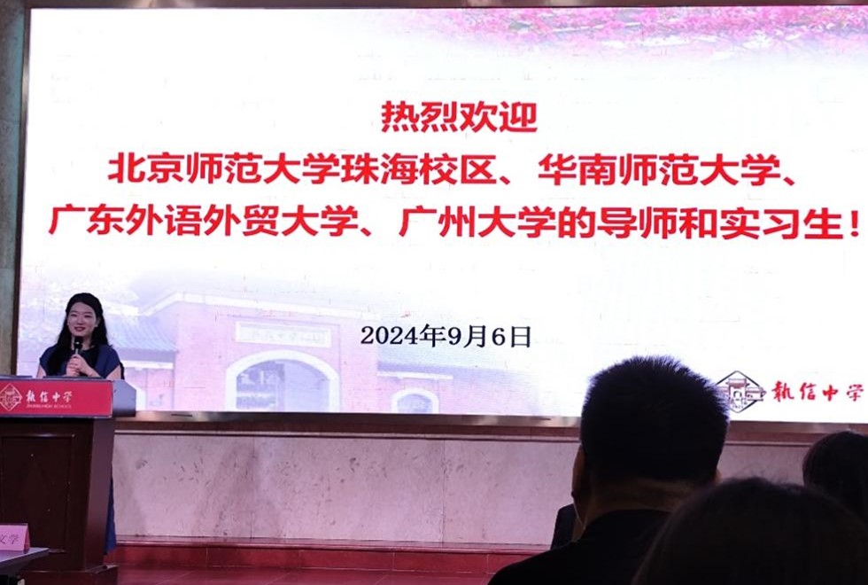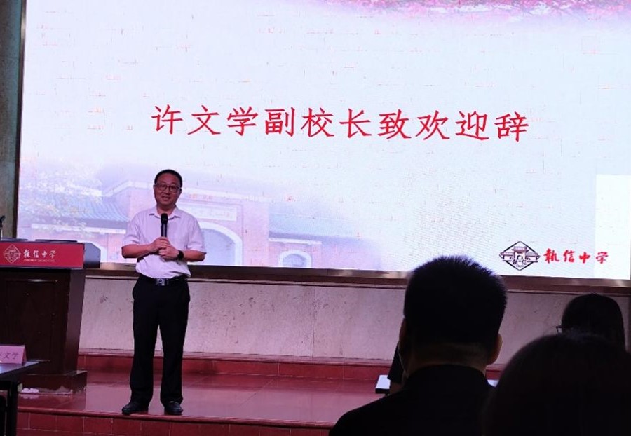 首先,大会由执信中学副校长许文学为实习生们致欢迎辞。许校长真诚热情地向各位导师与实习生介绍执信中学的历史与现状,让即将步入实习工作的实习教师们对执信中学有更深的认识,也提前让实习教师们对本学期的校园活动与工作有所了解与期待。