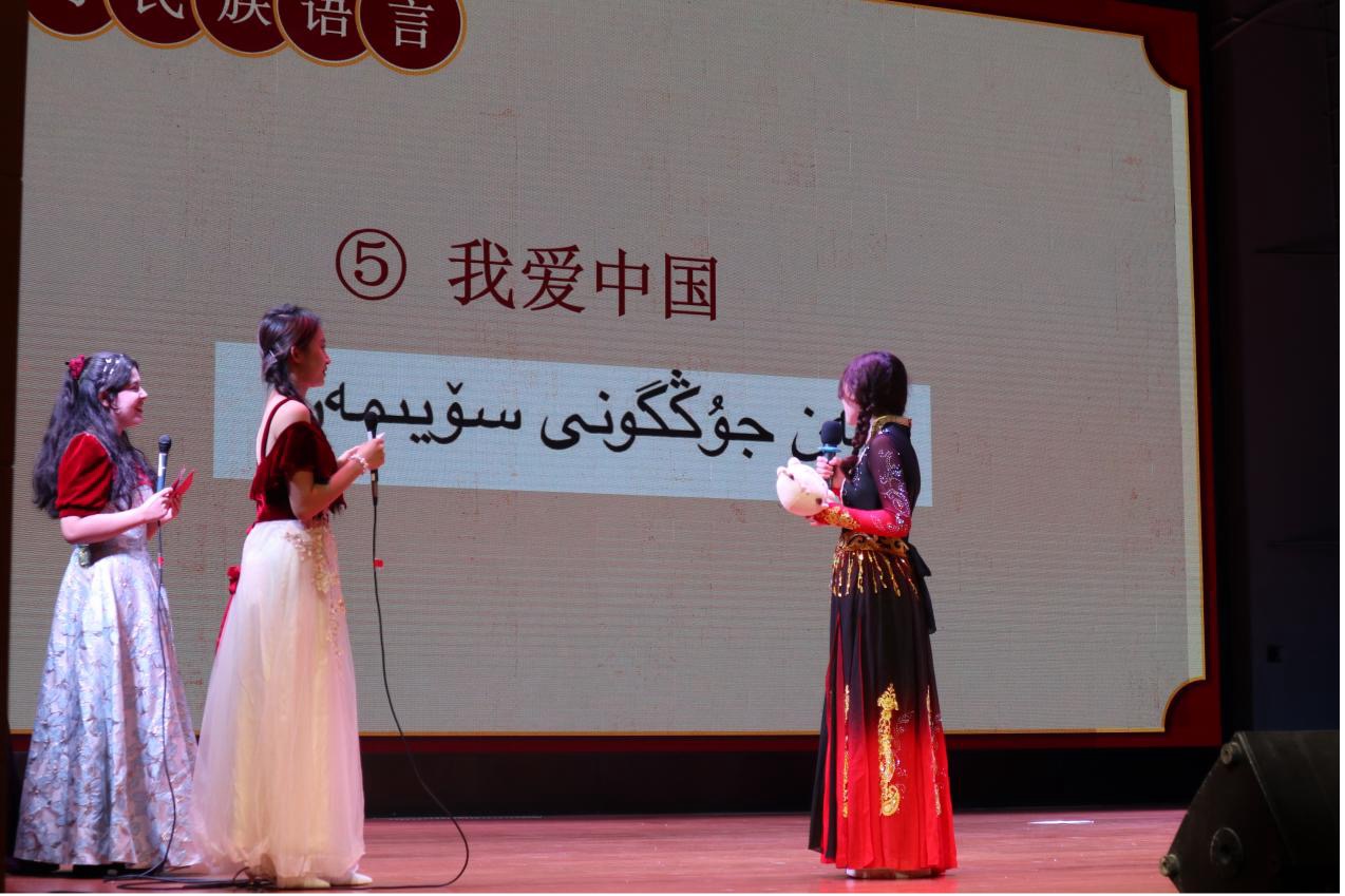 随着表演的结束,晚会开启游戏环节。“民族风俗猜猜猜”开启了一场文化之旅,观众们通过猜测展示图片所对应的民族节日,感受不同民族风俗的魅力。“击鼓传花”游戏选中五位幸运儿一同向主持人学习少数民族语言和汉语方言,感受不同语言文化间蕴含的拳拳爱国之情。