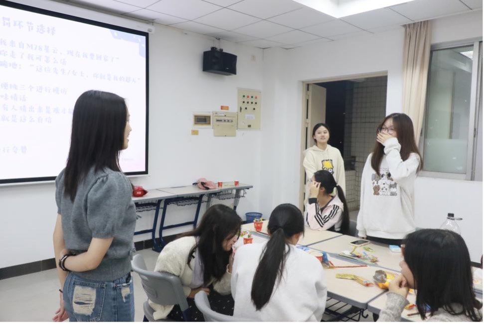 接下来,就是激动人心的游戏时间。八一十二一团学成员按会前的抽签分为八个小组进行游戏和积分比拼,积分前三名的小组可以获得奖励,积分最后一名的小组则要接受惩罚。三个游戏分别是emoji猜词、听歌识曲、抢椅子。emoji猜词考验了大家对四字词语的熟练程度,听歌识曲则让小组成员向大家展示了个人歌曲储备和描述能力,最为刺激的抢椅子游戏不仅考验了每组每轮派出的两位成员的反应速度,也调动了在场每位团学成员紧张的情绪。