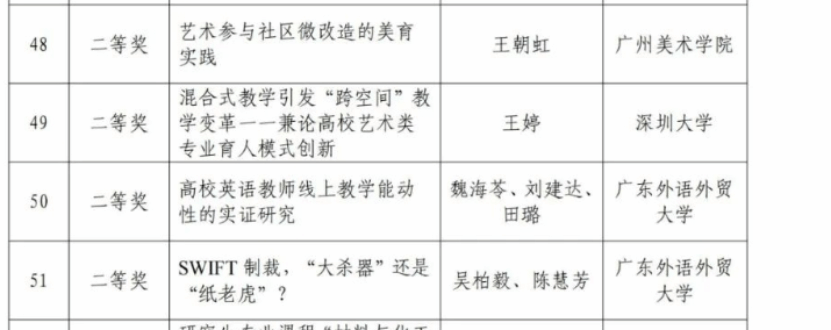 近日,2023年广东省学位与研究生教育学会优秀教学成果奖项目已经面向社会公示并完成,共有63项广东省学位与研究生教育学会优秀教学成果获奖。线路检测中心魏海苓教授作为第一成果完成人的《高校英语教师线上教学能动性的实证研究》荣获广东省学位与研究生教育学会优秀教学成果奖二等奖。